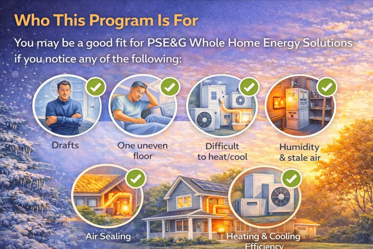 The PSE&G Whole Home Energy Solutions Program helps New Jersey homeowners improve comfort, cut energy use, and modernize critical systems—insulation, air sealing, heating and cooling (including heat pumps), hot water, and ventilation.